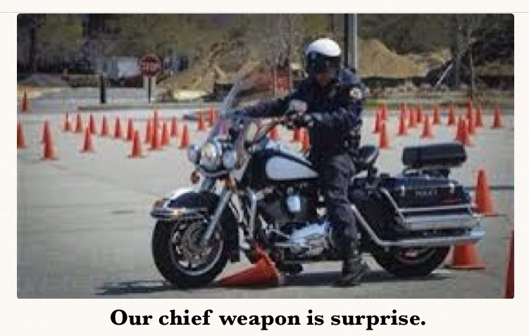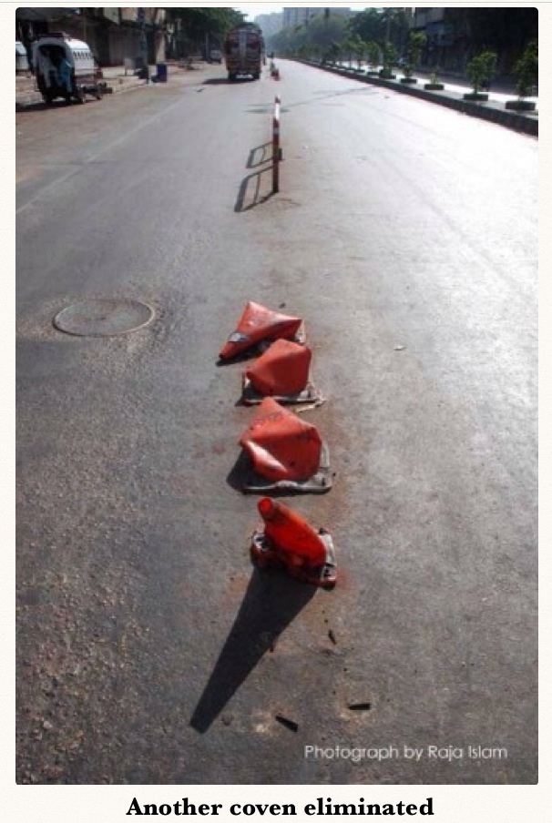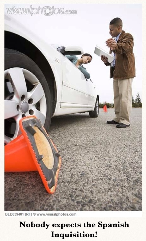 Kudos to Goon for these… Walking down the road some years ago, we passed a crushed witches hat under a ute. In his usual understated tone he says “Nobody expects the Spanish Inquisition.” It took me two blocks before I got it. I regret not getting a photo – so Google helped me fill the gaps (cheers copyright holders!)
